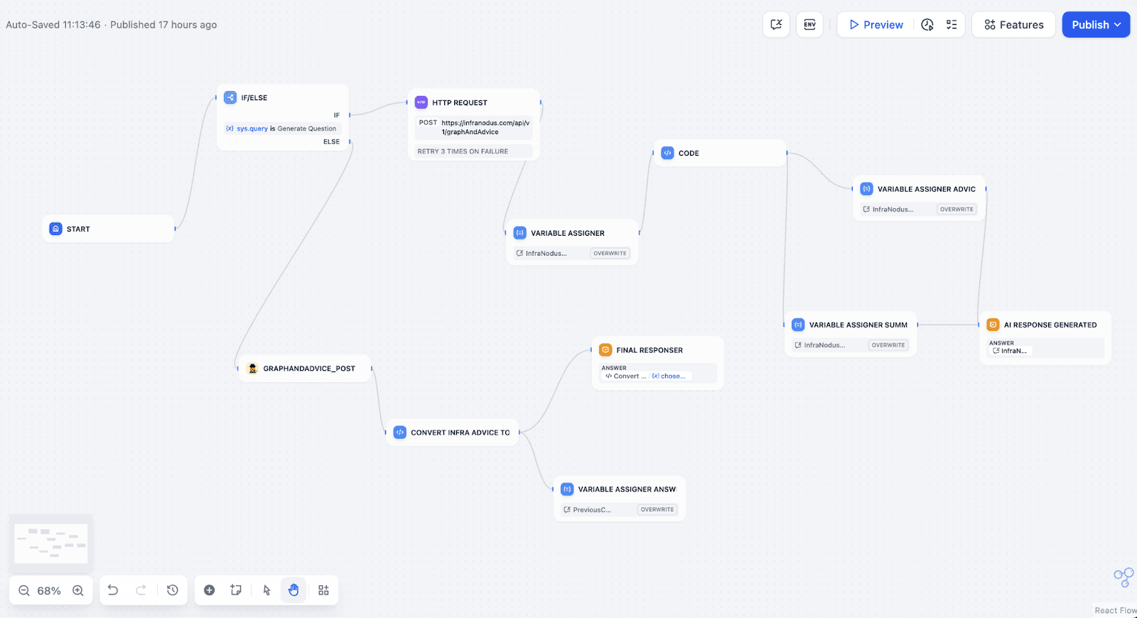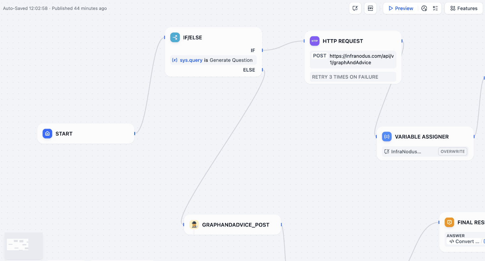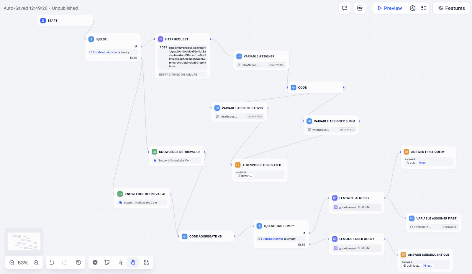 In the workflow's ELSE path (and also receiving input after the question-generating HTTP node), add the newly created InfraNodus Custom Tool node. Pass the user's query (sys.query) or the generated question to this tool. This tool will handle both context retrieval and initial response generation based on the graph.