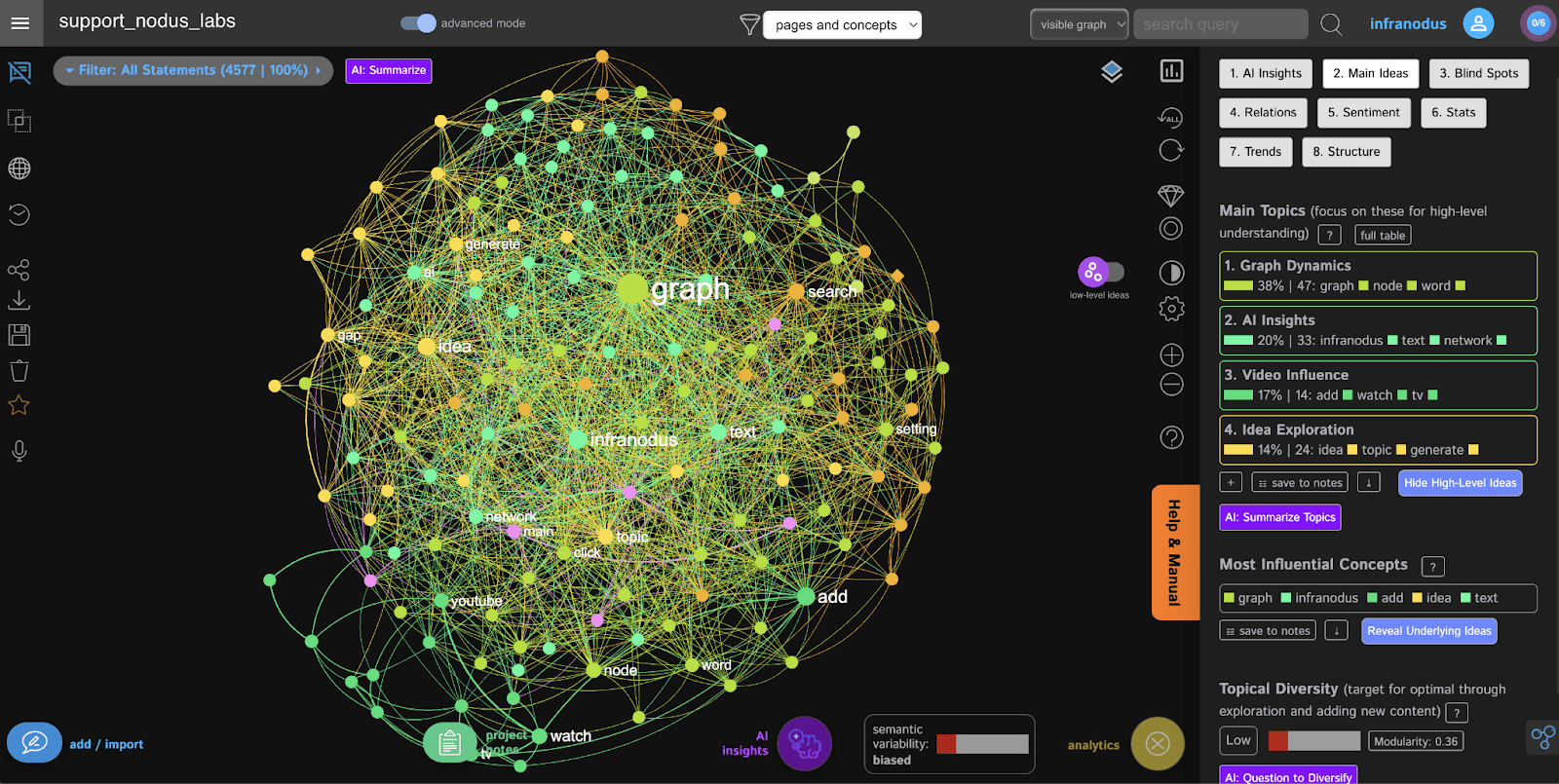 Before integration, it's often beneficial to refine the knowledge graph. In InfraNodus's Analytics Panel, check the Topical Diversity metric. If it's 'Low', the graph might be too focused on overly general concepts (like "graph" or "infranodus" in this example), leading to generic AI responses.