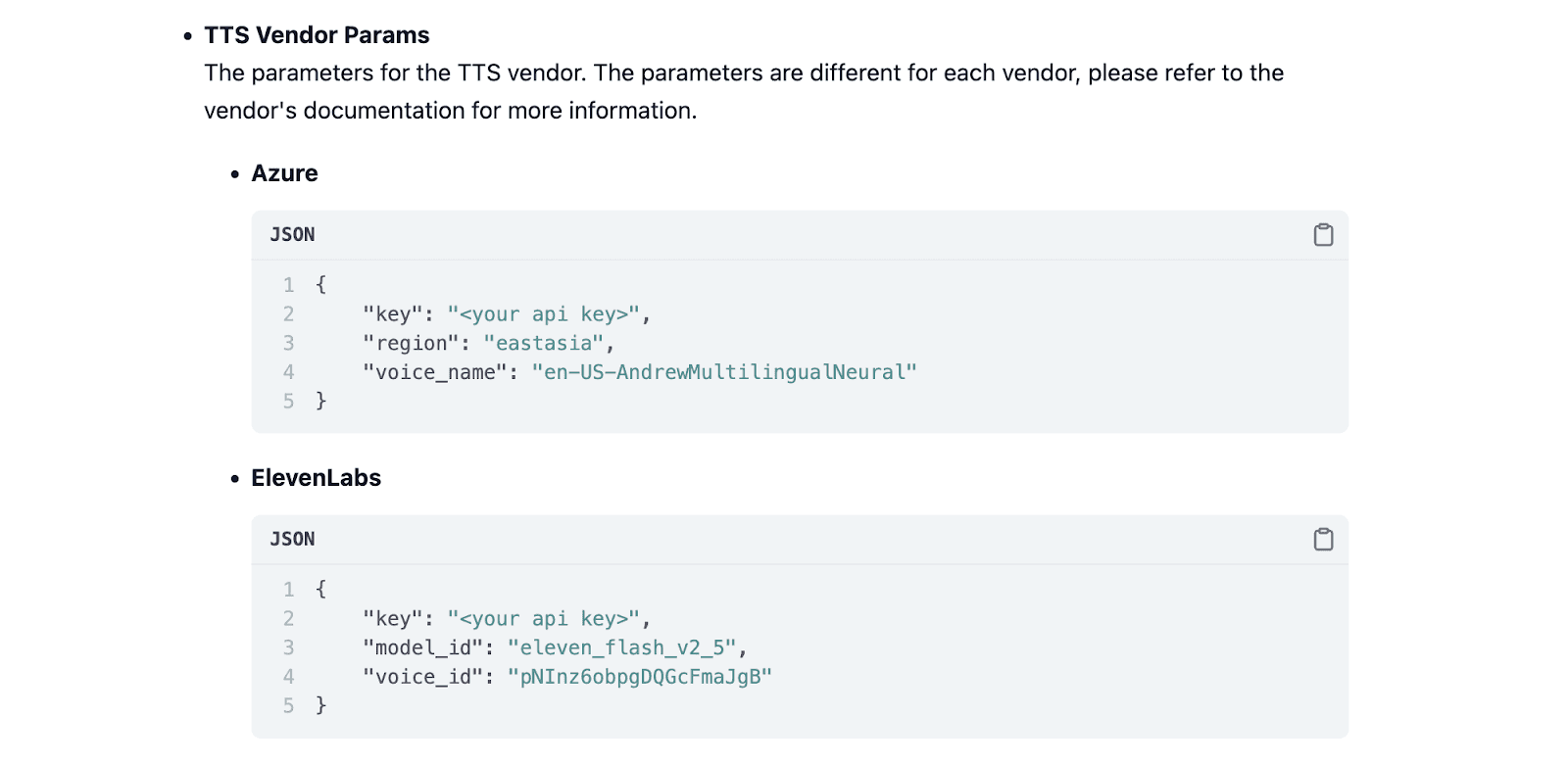 You can find examples of the TTS parameters (vendor dependent) in JSON format in the plugin’s ReadMe on Dify Marketplace.