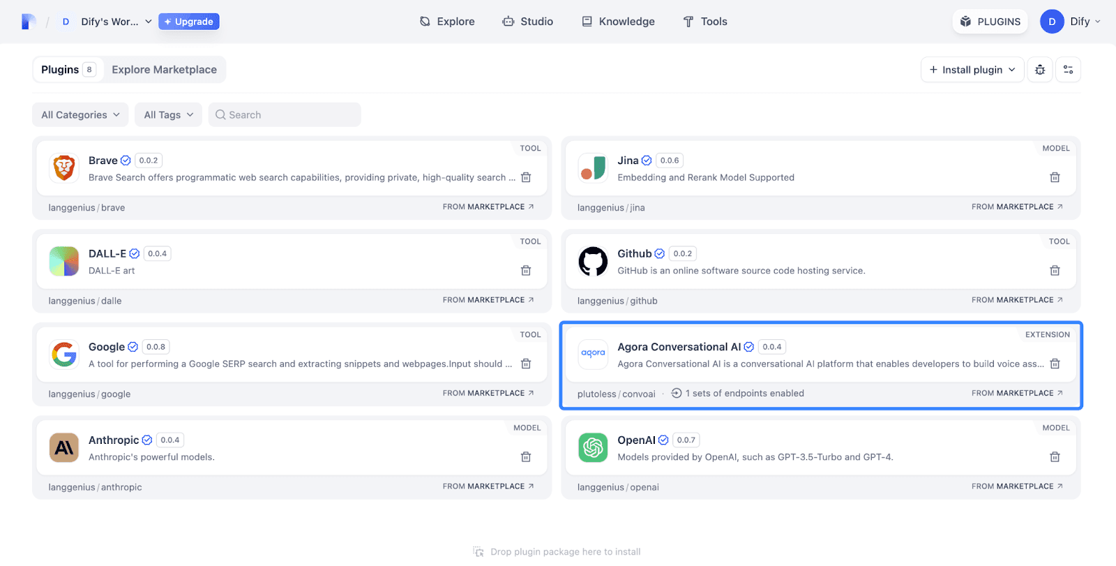 Enter the explore page of Dify Plugins, then find the “Agora Conversational AI” extension, and install it.