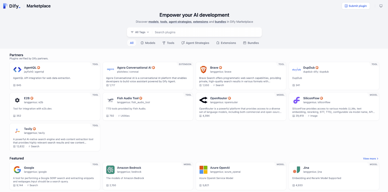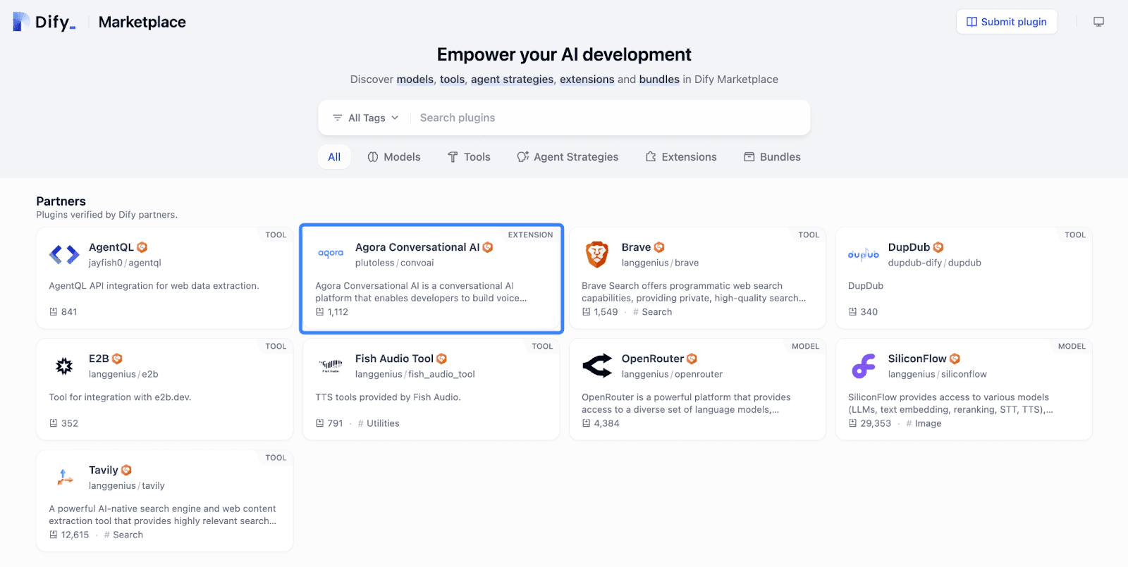 We have launched Marketplace with our v1.0.0 release, building on our open-source AI application development platform to create a thriving ecosystem. Our Marketplace now hosts over 120+ plugins—Models, Tools, Agent Strategies, Extensions, and Bundles—empowering you, our developers, to build and scale innovative solutions. With its modular architecture, developer-friendly tools, and distribution channels like community sharing and local deployment, it’s the perfect home for Agora’s Conversational AI Extension, driving real-time AI innovation within our community.