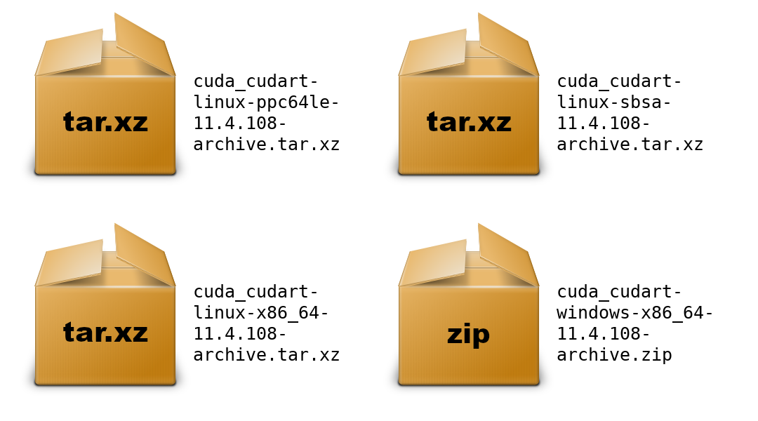These component .tar.xz and .zip binary archives do not replace existing packages such as .deb, .rpm, .run, conda, etc. and are not meant for general consumption, as they are not installers. However this standardized approach will replace existing .txz archives.