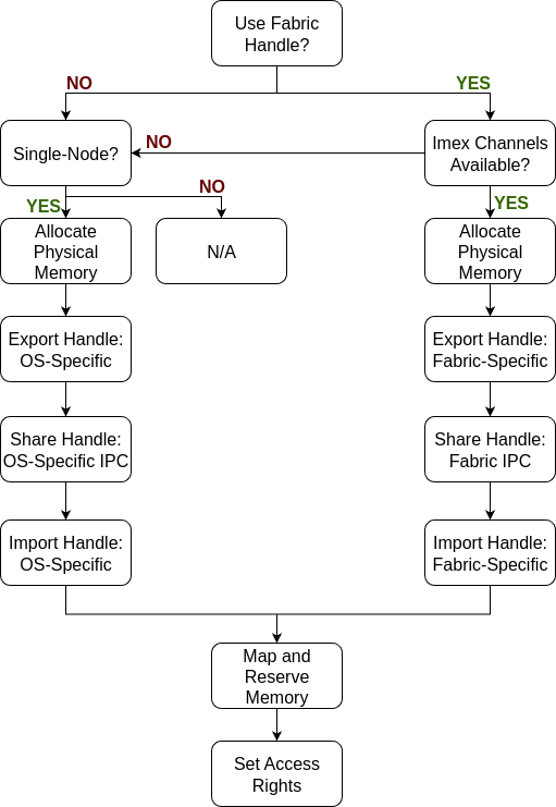 The VMM API workflow involves a sequence of steps for memory management, with a key focus on sharing memory between different devices or processes. Initially, a developer must allocate physical memory on the source device. To facilitate sharing, the VMM API utilizes handles to convey necessary information to the target device or process. The user must export a handle for sharing, which can be either an OS-specific handle or a fabric-specific handle. OS-specific handles are limited to inter-process communication on a single node, while fabric-specific handles offer greater versatility and can be used in both single-node and multi-node environments. It’s important to note that using fabric-specific handles requires the enablement of IMEX channels.