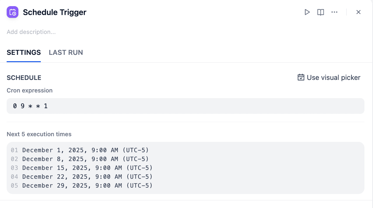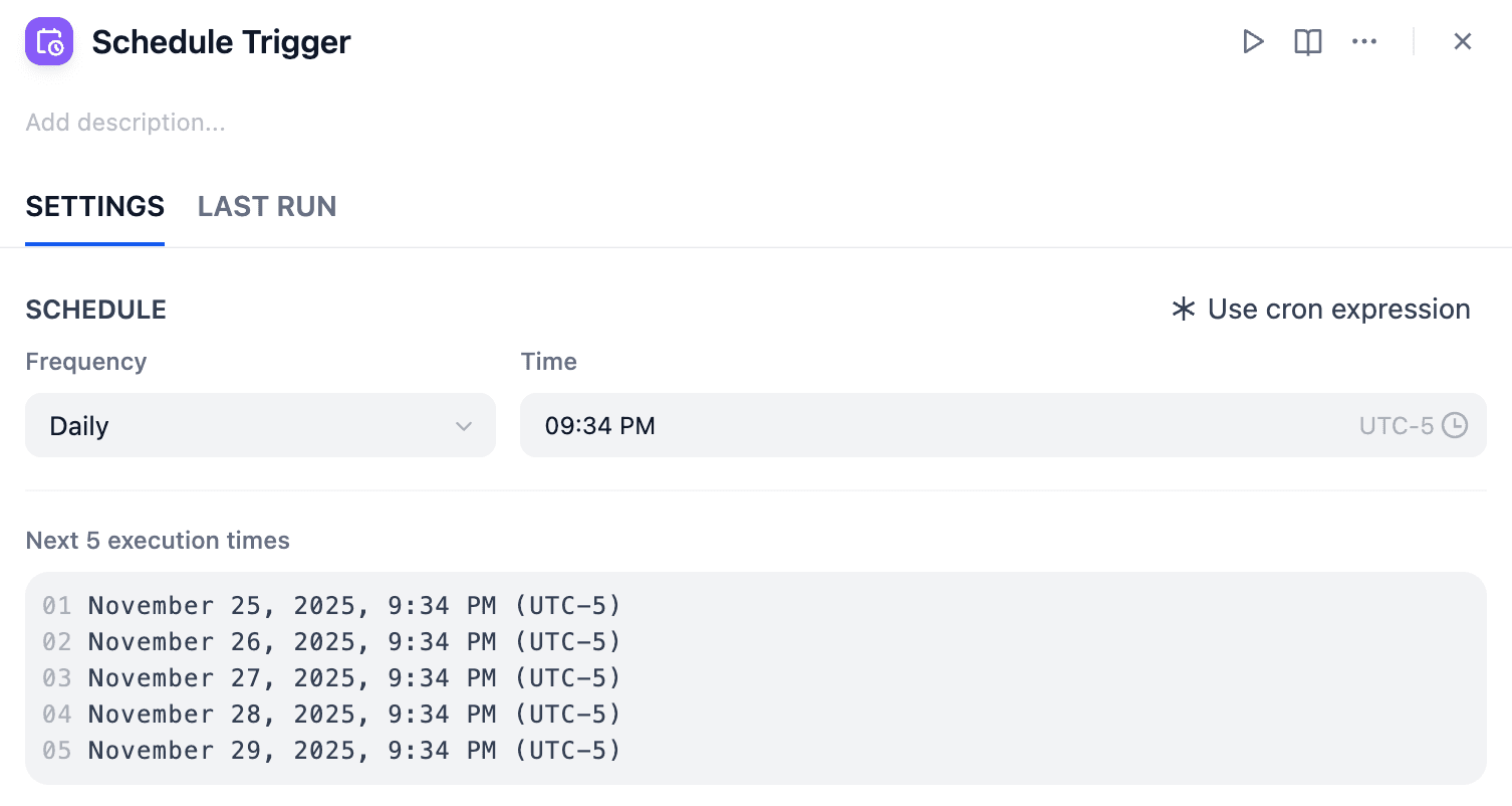 You can also use Cron expressions for precise schedule control, ideal for users familiar with Unix cron.