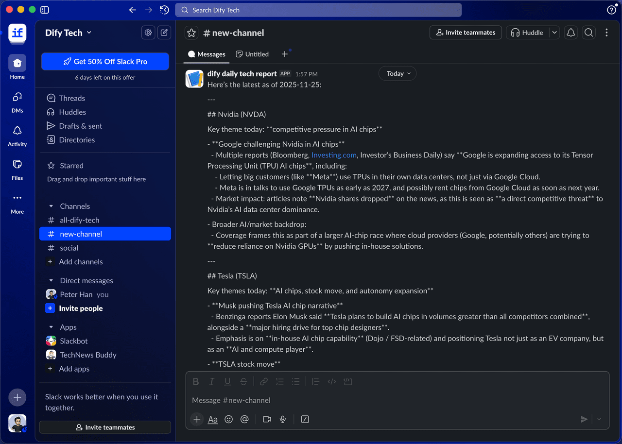 In fast-paced teams, waiting for someone to search for news, gather context, and share updates slows communication. Plugin Triggers allow workflows to react instantly when users mention an assistant inside Slack. This creates a fluid, conversational interface where team members can request insights naturally in their day-to-day communication environment — no switching tools, no extra steps.
