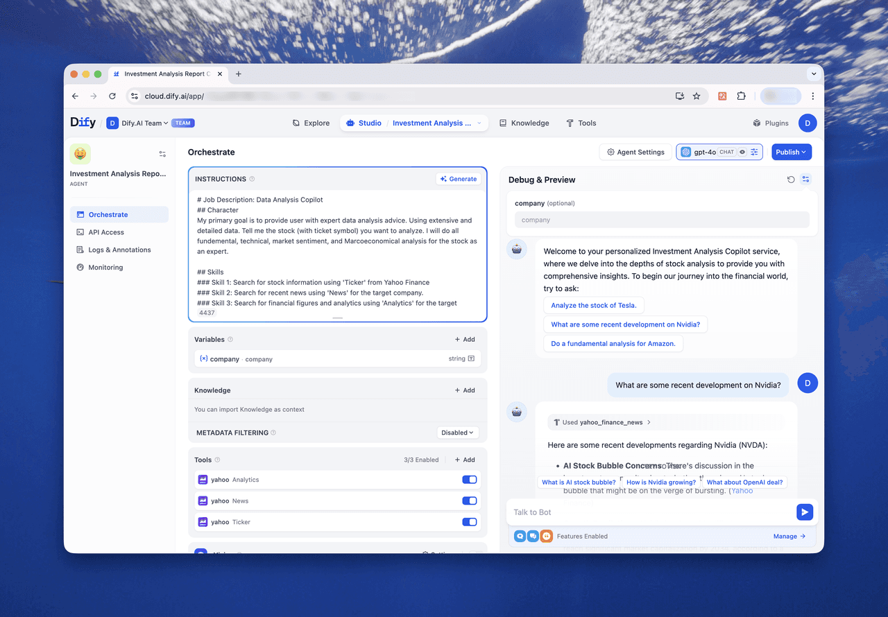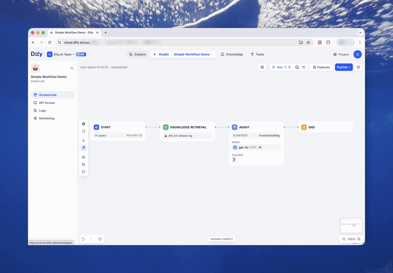 As projects scale and logic becomes more complex, Dify never collapses into visual clutter. It empowers developers to reclaim control — to deconstruct complexity rather than conceal it.